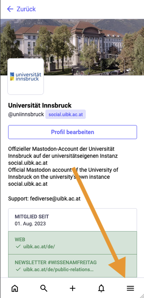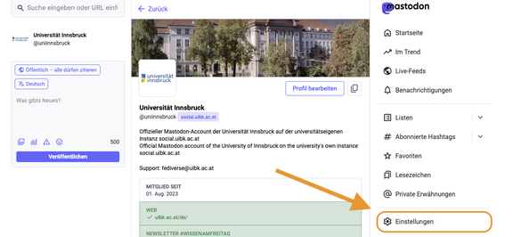 Wie auch in anderen sozialen Netzwerken können Sie bei Mastodon mit dem @-Symbol andere Accounts taggen. Aber Achtung: Bei Mastodon müssen Sie dafür sowohl den Usernamen als auch die Instanz angeben, zum Beispiel: @uniinnsbruck@social.uibk.ac.at