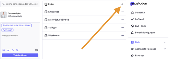 Um eine Liste zu erstellen, klicken Sie in der rechten Seitenleiste einfach auf „Listen“ und dann oben auf das Plus-Symbol: