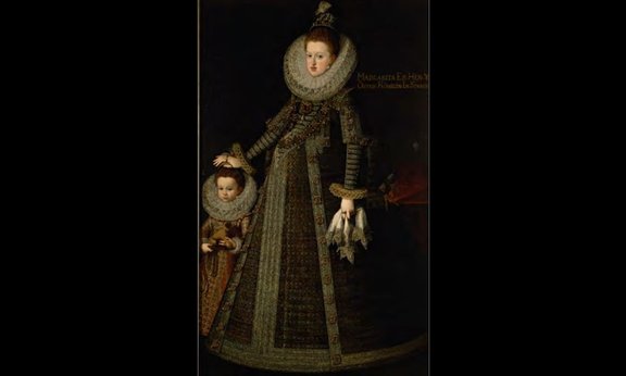 Bartolomé González y Serrano (oder Juan Pantoja de la Cruz?), nach 1601 beschriftet: MARGARITA.ER[z]HER[zogin] Z[u] ÖSTER[reich]KÖNIGIN IN SPANIE[n] Öl auf Leinwand; H. 192 cm, B. 120 cm