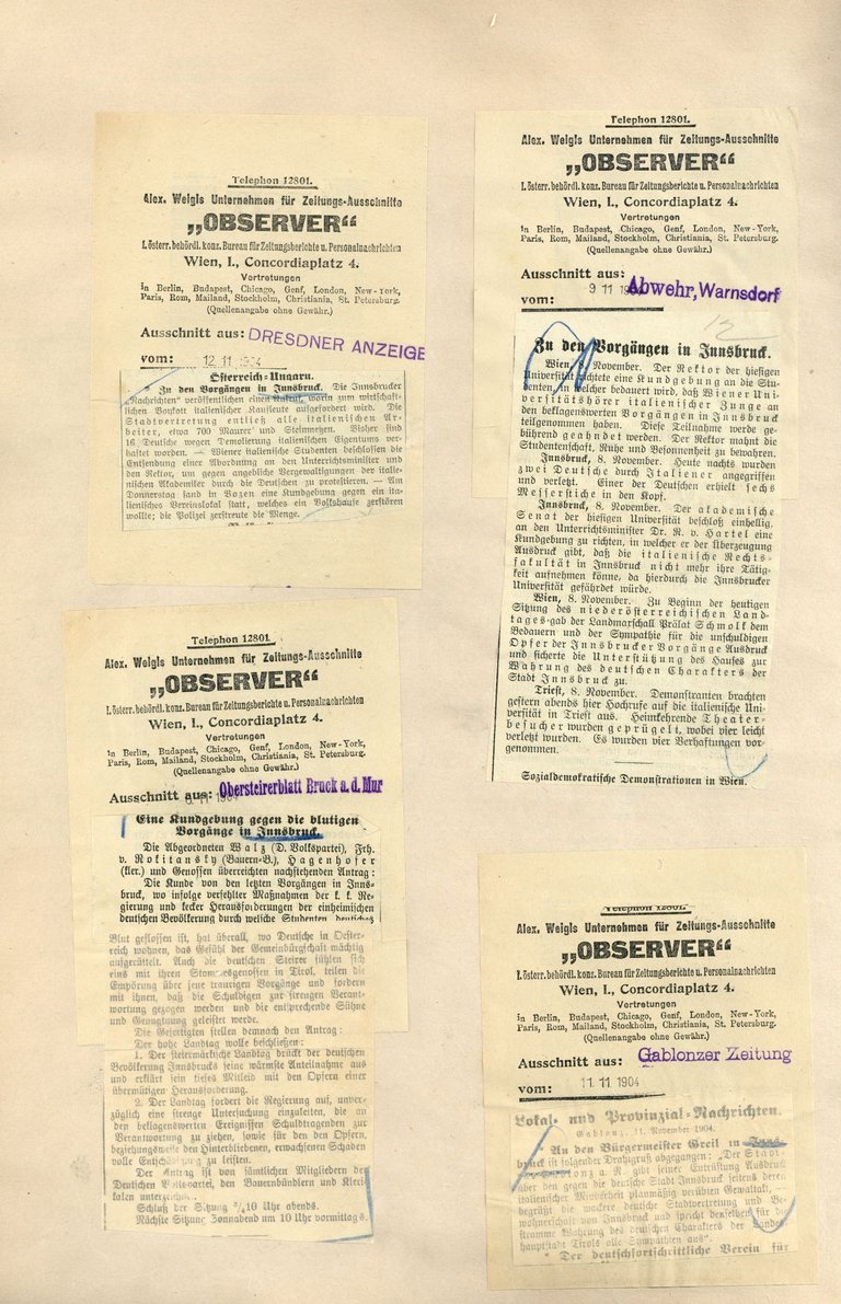 Im ausgehenden 19. Jahrhundert stieg die Anzahl der Zeitungen. Es bildeten sich auch spezielle Einrichtungen, die die Auswertung der Zeitungen zu einem Geschäftsmodell machten: Das Wiener Büro „Observer“ war das erste seiner Art in der Habsburgermonarchie. Darauf geht auch die Sammlung im Stadtarchiv zurück. In neun großformatigen Bänden, die ein weltweites Echo zu den „Race Riots in Austria“ (so der Daily Telegraph vom 9. Nov. 1904) dokumentieren, finden sich 4.549 Presseausschnitte. Diese wurden in einer Lehrveranstaltung der Universität erstmals ausgewertet und vom Stadtarchiv zugänglich gemacht: https://fatti.stadtarchiv-innsbruck.at/suche.php