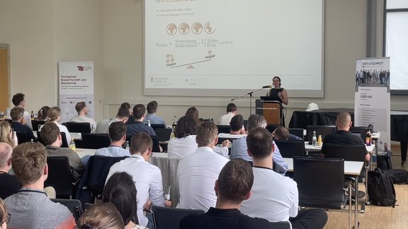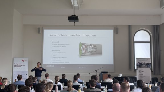 Felix Ehmke präsentierte ein neues Forschungsvorhaben unseres Arbeitsbereichs mit dem Titel „Qualitätsbewertung der Ringspaltverfüllung mit Perlkies im maschinellen Hartgesteinsvortrieb“. Dabei stellte er die Frage, wie effektiv die Hinterfüllung mit Perlkies ist und wie die Bettungsprozesse optimiert werden können. Zur Beantwortung dieser Fragen werden Drucksensoren bündig in die Außenseite der Tübbinge einbetoniert, um präzise Messungen zu ermöglichen.