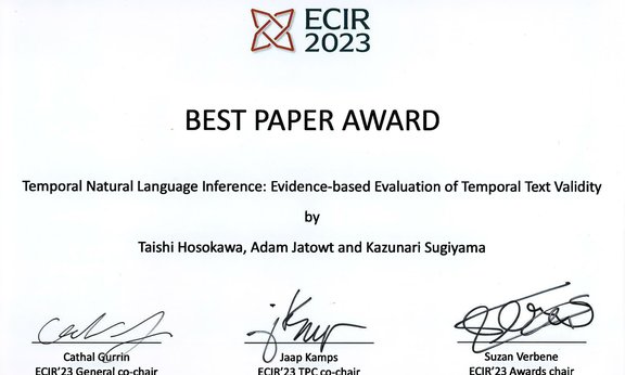 Die European Conference on Information Retrieval (ECIR) ist die wichtigste europäische Konferenz zur Präsentation der neuesten Ergebnisse im Bereich "Information Retrival". Von den 175 akzeptierten Beiträgen wurde Prof. Adam Jatowt gemeinsam mit seinen Co-Autoren Taishi Hosokawa und Kazunari Sugiyama mit dem Best Paper Award für ihren Beitrag "Temporal Natural Language Inference: Evidence-based Evaluation of Temporal Text Validity" ausgezeichnet.