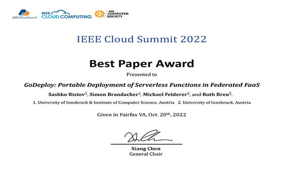 Sashko Ristov erhielt zusammen mit Simon Brandacher, Michael Felderer und Ruth Breu den Best Paper Award für ihr Paper"GoDeploy: Portable Deployment of Serverless Functions in Federated FaaS" auf der IEEE Cloud-Gipfel 2022, die virtuell und an der George Mason University in Fairfax, Virginia, stattfand.