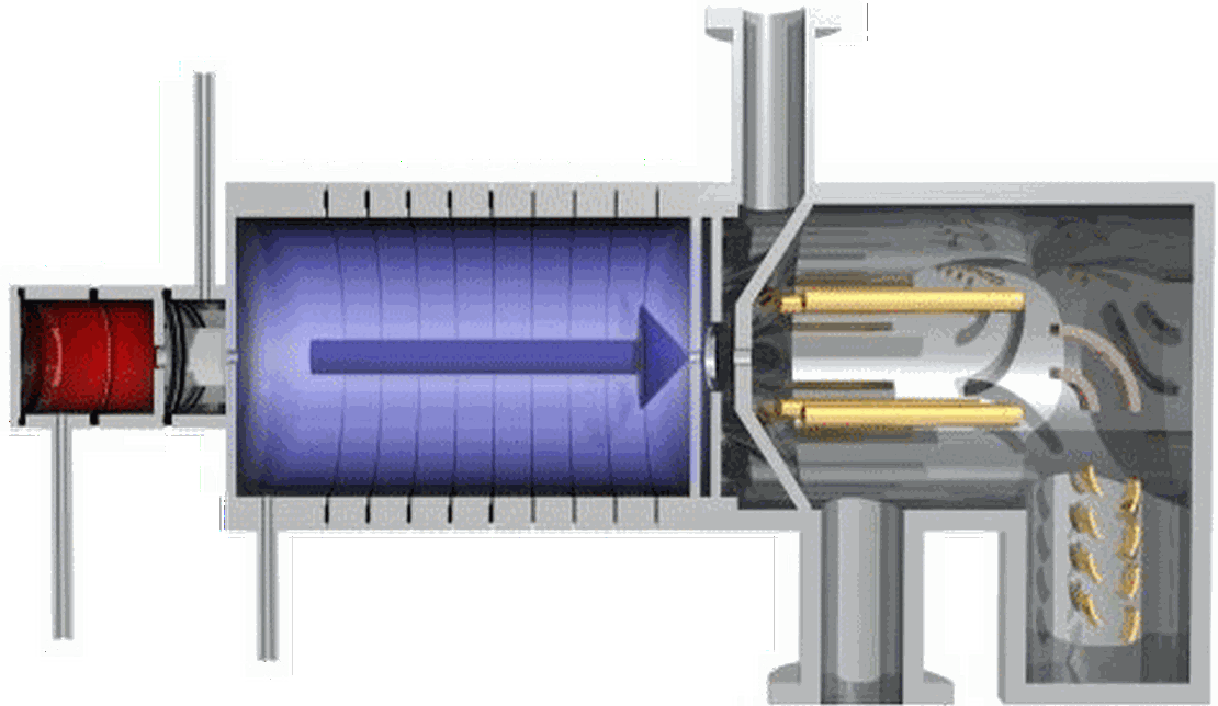 Ein Protonentauschreaktions-Massenspektrometer (PTR-MS) erlaubt Echzeitmessungen von Spurengasen mit Konzentrationen von nur wenigen pptv. Die Methode basiert auf Reaktionen von H3O+-Ionen aus der Hohlkathode (rot), die nicht-dissoziativen Protonen-(H+-)Tausch auf die meisten der üblichen flüchtigen organischen Verbindungen (VOCs) durchführen, aber nicht mit den Hauptkomponenten von sauberer Luft reagieren. Diese Reaktionen finden in der Driftröhre statt (blau).