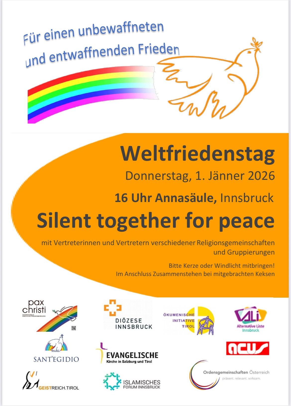 Anlässlich des Weltfriedenstages lädt das Institut für Islamische Theologie und Religionspädagogik der Universität Innsbruck herzlich dazu ein, am 1. Jänner 2026 um 16.00 Uhr bei der Annasäule in Innsbruck zusammenzukommen.