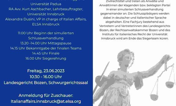 Am FREITAG, 23. Juni 2023 findet die Abschlussverhandlung des Moot Courts aus italienischem Zivilrecht im Schwurgerichtssaal des Landesgerichts Bozen statt. Vier Teams, zwei in deutscher und zwei in italienischer Sprache, werden dabei in der Rolle der Verteidiger der klagenden bzw. der beklagten Partei einen Fall vor Gericht verhandeln. Ein herzlicher Dank geht an alle Partner, Tutoren und Sponsoren für die gute Zusammenarbeit und Unterstützung.