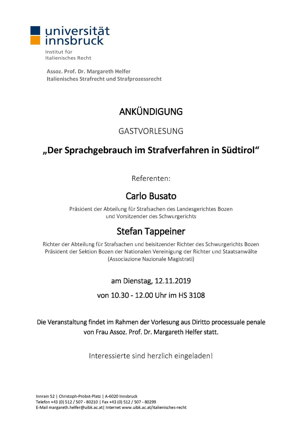 12. November 2019: Gastvorlesung "Der Sprachgebrauch im Strafverfahren in Südtirol"