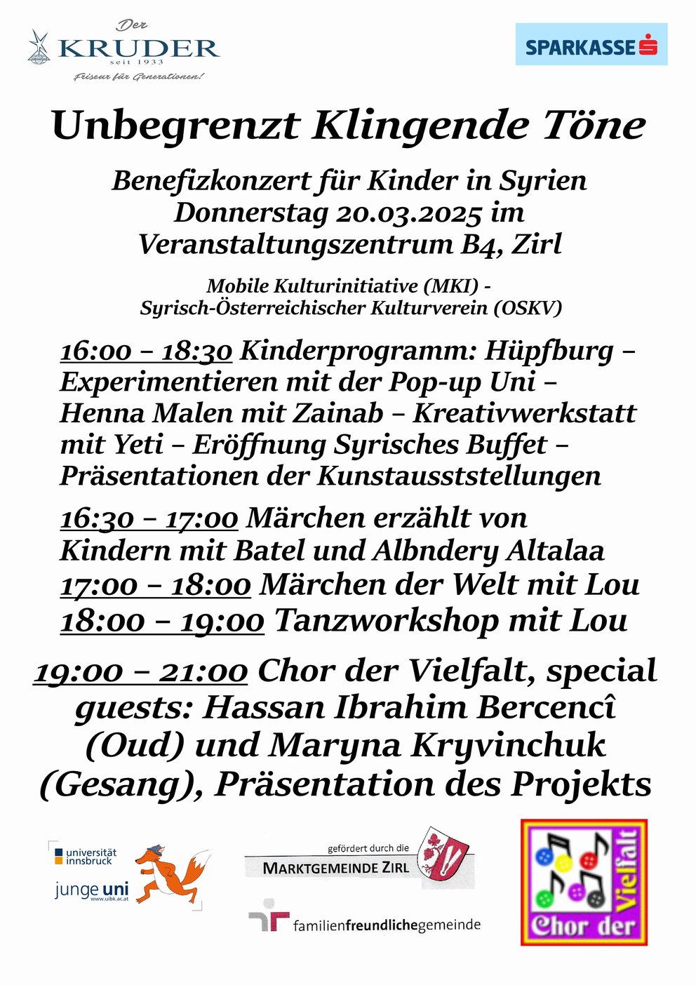 Am Donnerstag, 20.3. findet im Veranstaltungszentrum B4 in Zirl unter dem Motto „Unbegrenzt klingende Töne“ ein Benefizkonzert für Kinder in Syrien statt, das von der mobilen Kulturinitiative (MKI) und dem syrisch-österreichischen Kulturverein (OSKV) organisiert wird. Von 16:00 – 21:00 gibt es ein buntes Kinderprogramm mit Experimentieren mit der Pop up Uni, die Kreativwerkstatt mit Yeti, eine Hüpfburg, ein Tanzworkshop mit Lou und vieles mehr. Ab 19:00 Uhr singt der Chor der Vielfalt. Der Eintritt ist gratis, das syrische Buffet mit kulinarischen Köstlichkeiten ist ab Nachmittag geöffnet.