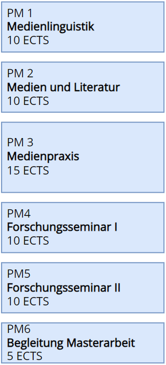 Das Masterstudium Medien ist modular aufgebaut und verbindet wissenschaftliche Vertiefung mit individueller Schwerpunktsetzung. Es umfasst insgesamt 120 ECTS und gliedert sich in Pflichtmodule (60 ECTS-AP), Wahlbereich (30-ECTS-AP) und die Masterarbeit (30 ECTS-AP). Studierende erwerben grundlegende Kompetenzen in Medienlinguistik, Medienkultur, Theorie und Praxis und haben zugleich die Möglichkeit, eigene Interessen gezielt zu vertiefen – etwa durch interdisziplinäre Lehrveranstaltungen oder ein individuelles Wahlpaket.