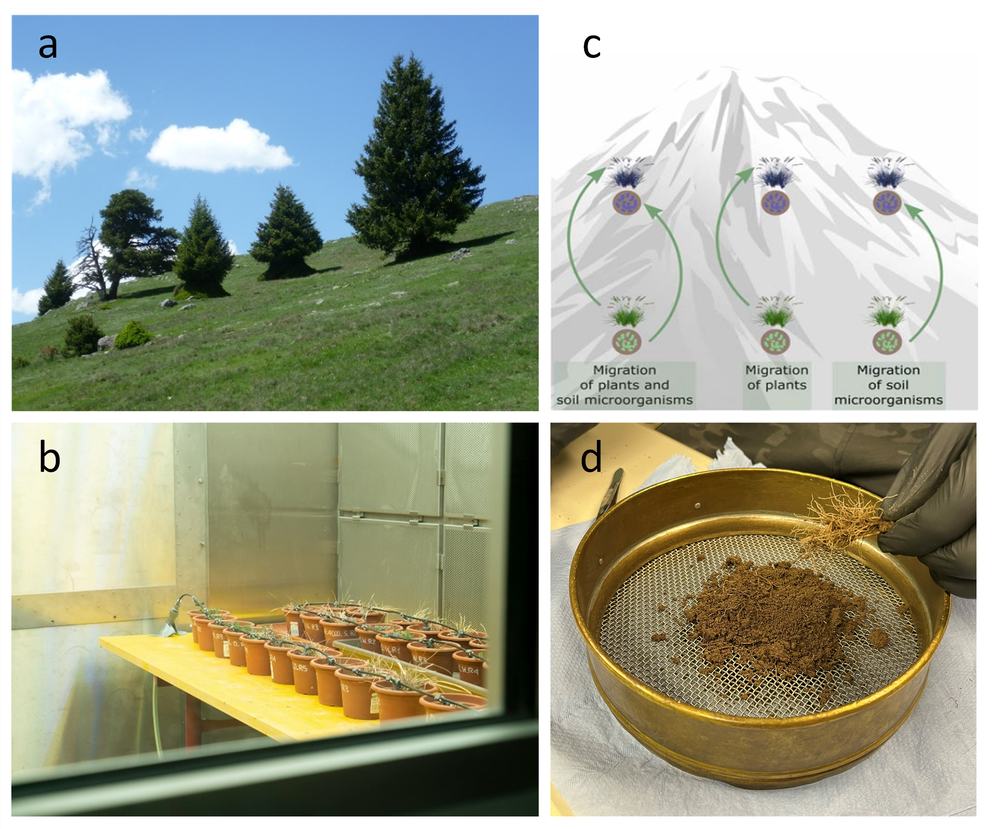 a: Experimental site at 2000 m a.s.l., Matschertal, Italy (credit: Paul Illmer); b: Hypobaric chamber set to conditions simulating 4.000 m a.s.l. (credit: Eurac Research, Annelie Bortolotti); c: Schematic scheme of migration scenarios for plants and soil microorganisms in alpine ecosystems; d: Extraction of rhizosphere soil from plant roots (credit: Nadine Praeg).