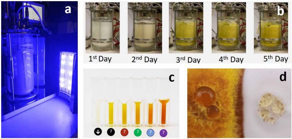 (a) Photobioreaktor, (b) Bioreaktorkultivierung mit Xanthoepocinproduktion (Gelbfärbung) im Verlauf einer Woche, (c) Kulturfärbung von Bioreaktor-Batchkulturen in Abhängigkeit von den Belichtungsbedingungen während der Kultivierung, (d) Gutationstropfenbildung bei Co-Kultivierung auf Petrischalen (Photomaterial von J. Winkler, F. Burgstaller, J. Metzlaff und M. Meitinger).