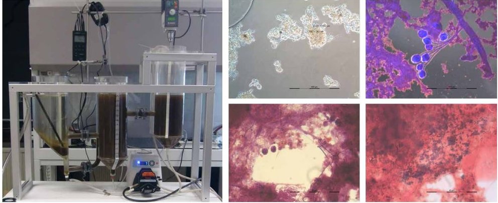 Laborkläranlage und Beispiele mikroskopischer Klärschlammpräparate