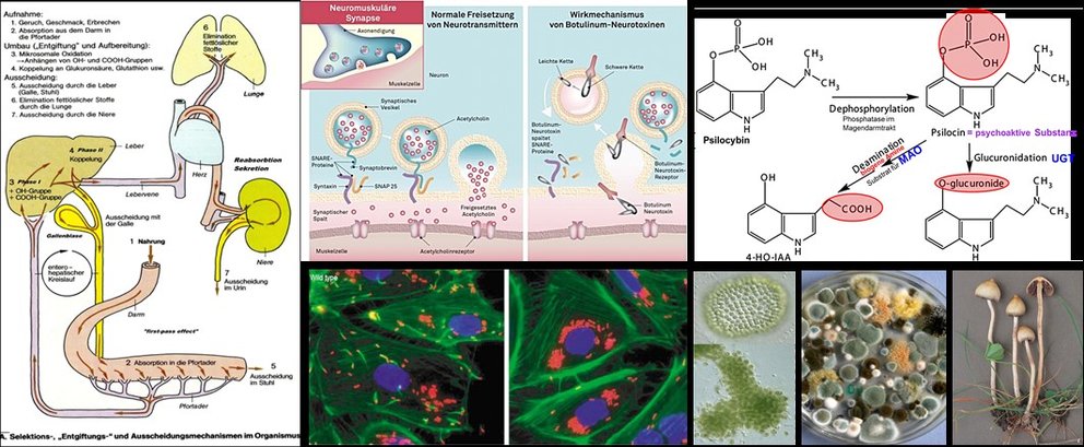 Abbildungen: v.l.n.r: (Fremd)stoff- Metabolismus; Bsp. Botulinumtoxin Wirkungsweise; Bsp. Psilocybin Um,-Abbau; unten: v.l.n.r: intrazelluläre Salmonella: l. Ausbreitung, r. Mutante; Microcystis Alge, Schimmelpilze, Psilocybe sem.;