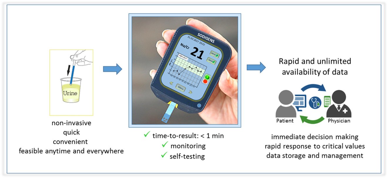 Störungen des Körpernatriumhaushalts stellen signifikante gesundheitliche Probleme dar, von denen weltweit mehr als zwei Milliarden Menschen betroffen sind. Gegenwärtig wird der Natriumstatus in der klinischen Routine invasiv durch Messung der Natriumkonzentration im Blutplasma bestimmt. Das in Innsbruck entwickelte Produkt SODISENS ist ein neuer nicht-invasiver Point-of-Care-Test, der die schnelle Diagnose und das effiziente Monitoring des Natriumhaushalts ermöglicht. Der Urin-Test bestehend aus einem Einmal-Teststreifen und einem tragbaren Readoutmeter ist einfach zu bedienen und kann überall und jederzeit direkt am Patienten und auch von ihm selbst durchgeführt werden. SODISENS bietet dadurch die höchste Mobilität und Flexibilität für die Patienten bei gleichzeitiger Verminderung von ernsthaften Komplikationen, die durch Natriumhaushaltsstörungen resultieren können, und eine deutliche Entlastung für das Gesundheitswesen durch die Reduzierung von Arztbesuchen und Kosten.