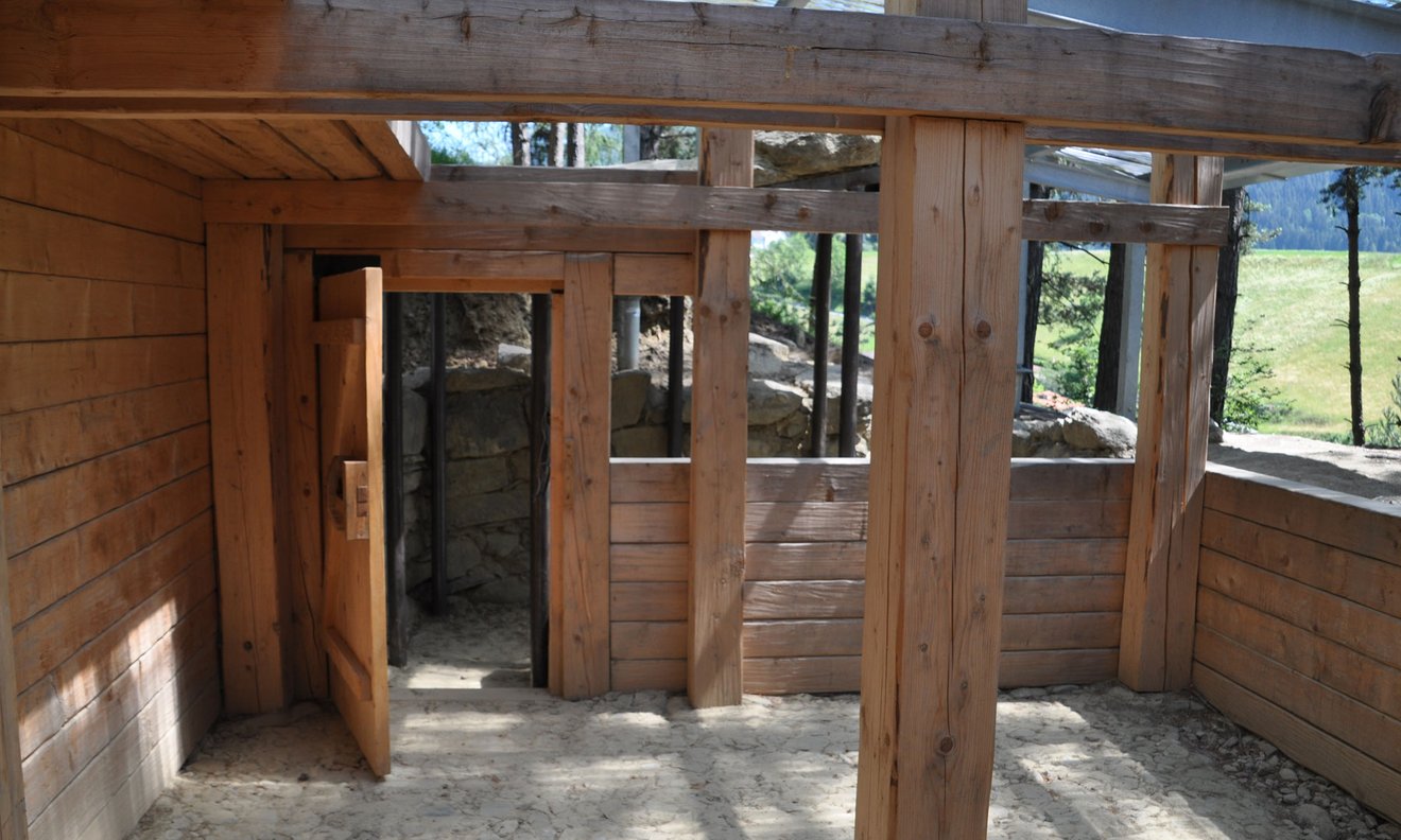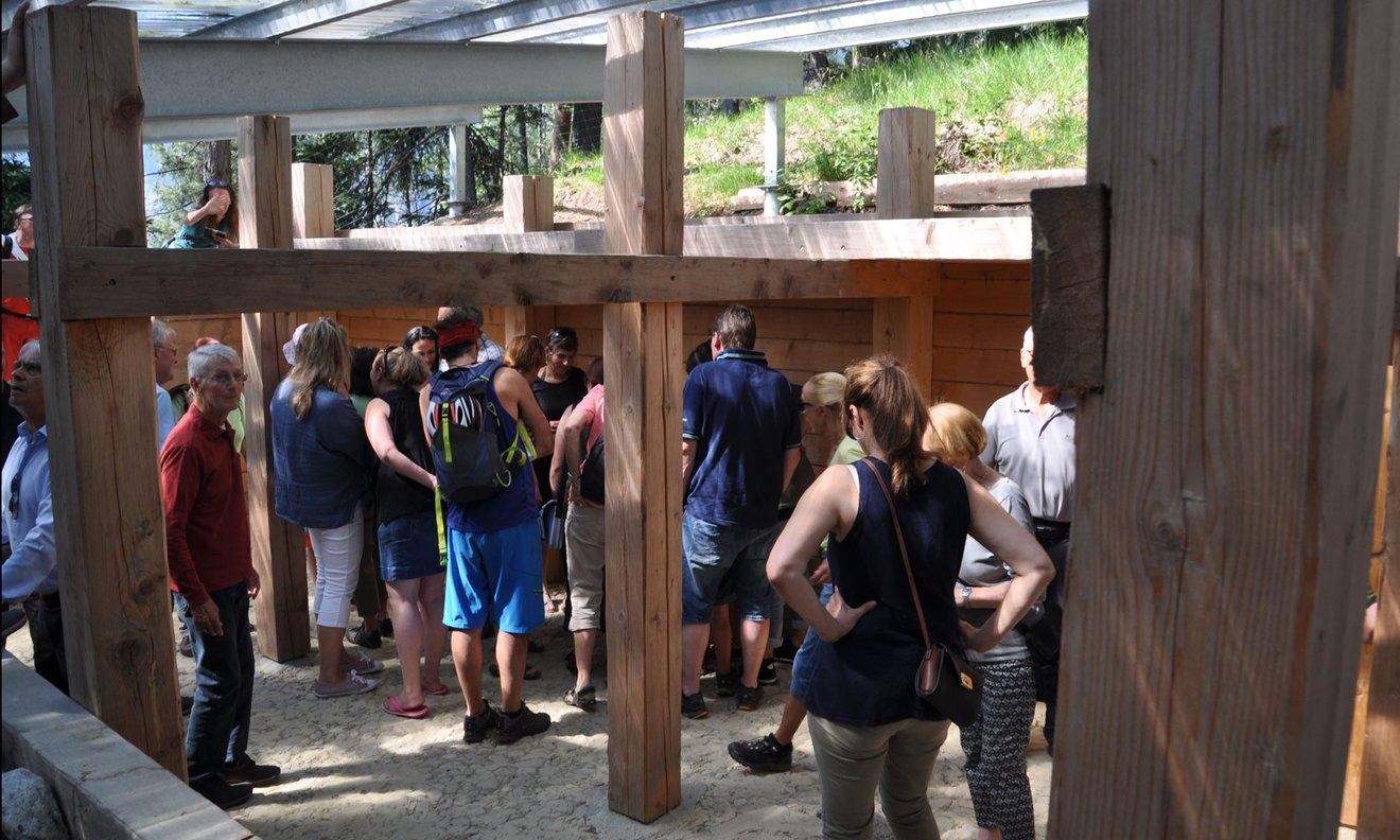 Das konservierte und rekonstruierte „Haus VI“ und interessierte Besucherinnen und Besucher darin (Beide Bilder: Silvia Gradl)