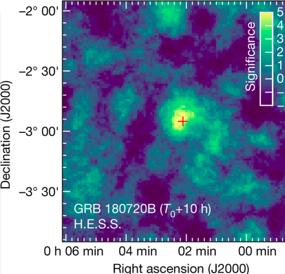 Am 20. Juli 2018 meldeten der Fermi Gamma-Ray Burst Monitor (GBM) und das Burst Alert Telescope des Neil Gehrels Swift Observatory (BAT) kurz nacheinander einen Gammastrahlenausbruch, genannt GRB 180720B. Diese Stelle am Himmel wurde sogleich von weiteren astronomischen Observatorien beobachtet. Obwohl sich die Intensität dieser Phänomene („Blitze“) innerhalb von Sekunden stark verringert und die Himmelsregion erst 10 Stunden später ins Gesichtsfeld von H.E.S.S. (High Energy Stereoscopic System) in Namibia kam, richteten Wissenschaftler der H.E.S.S.-Kollaboration ihr größtes Teleskop dennoch dorthin. Überraschend konnte noch 10 bis 12 Stunden nach dem Ausbruch eine neue Gammastrahlenquelle an der Position von GRB 180720B nachgewiesen werden.