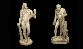 Bei den Dargestellten handelt es sich um zwei völlig gegensätzliche Figuren, Abgüsse von römischen Kopien, welche sich auf hellenistische griechische Originale beziehen. Die eine Statuette, deren Original sich in der Glyptothek in München befindet, stellt den mythischen Helden Herakles dar, der zwölf Aufgaben zu bewältigen hatte. Muskulös in heroischer Nacktheit weisen seine Attribute auf einige dieser Taten hin. Über Kopf und Schulter trägt er das Fell des von ihm getöteten nemeischen Löwen, seine Keule ruht auf dem Kopf eines Stieres. Dabei handelt es sich um den kretischen Stier, der nachdem er in wilder Raserei große Verwüstungen auf der Insel angerichtet hatte erst von Herakles gezähmt werden konnte. In der erhoben linken Hand hält Herakles die goldenen Äpfel, die er durch eine List aus dem Garten der Hesperiden gestohlen hatte. In starkem Kontrast dazu steht die zweite Statuette, deren Original sich in der Villa Albani in Rom befindet. Dargestellt ist der Philosoph Diogenes, der den Kynismus, eine Strömung der Philosophie, welche das einfache Leben und absolute Bedürfnislosigkeit propagierte, begründet hatte. Er verzichtete somit auf Kleidung und Nahrung, hatte keinen festen Wohnsitz und keine Ehefrau. Das Bildnis zeigt dies Einstellung anschaulich. Diogenes, auf sein Äußeres keinen Wert legend, ist nackt dargestellt, hält in der rechten Hand die Schale eines Bettlers und wird von einem Hund begleitet. Von dessen griechischer Bezeichnung „Kynon“ leitet sich auch der Name der Anhänger seiner Lehre, „Kyniker“, ab.