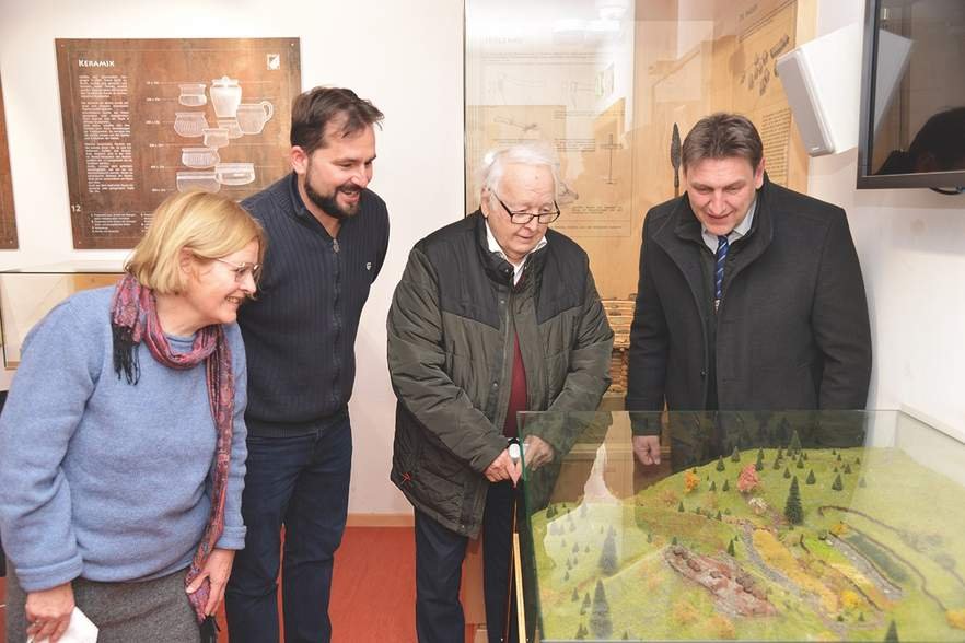 Präsentation des Modells (von links): Dr. Annegret Waldner (Leiterin des Rätermuseum Birgitz), assoz.-Prof. Mag. Dr. Florian Müller (Leiter der archäologischen Ausgrabungen auf der „Hohen Birga“, Universität Innsbruck), Karl Reisegger (Gestalter des Modells), Ing. Markus Haid (Bürgermeister von Birgitz).