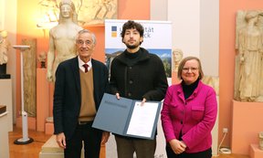 „In seinem eingereichten Schreibvorhaben ‚12 Kurzgeschichten‘ schildert der angehende Autor Simon Chkheidze nicht nur auf liebevolle und empathische Weise sowie mit musikalischer Sprache unterschiedliche originelle Charaktere, sondern bezieht auch die wechselvolle Geschichte Georgiens mit ein, um schließlich in der Gegenwart anzukommen und europäische Werte, wie Demokratie, Freiheit und Frieden zu reflektieren“, beschrieb Laudatorin Gabriele Wild vom Literaturhaus die ausgezeichnete Arbeit des jungen Preisträges Simon Chkheidze.