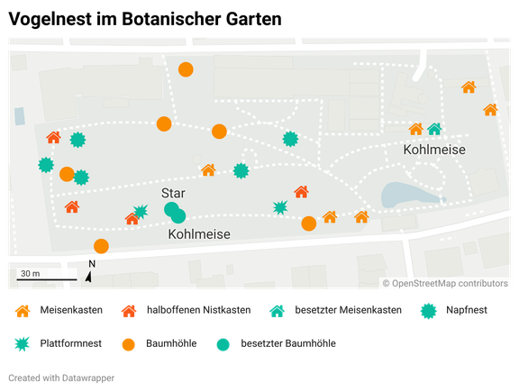 Der Botanische Garten der Universität Innsbruck zeigt, wie eine vogelfreundliche Stadtlandschaft aussehen kann. Hier gibt es eine Vielzahl von Mikrohabitaten, darunter ein kleiner Teich, verschiedene Grasflächen, eine Fülle von Blumen, alte Bäume, Sträucher, Büsche und felsige Abschnitte, die ideale Unterschlupfmöglichkeiten für Insekten bieten. Der Garten bietet Strukturen wie Totholzanlagen, Reisigzäune und ungemähte Wiesen, die die Vermehrung von Raupen, Käfern und Larven begünstigen. Mehrere kleine Quellen innerhalb des Gartens bieten Vögeln sichere Trink- und Bademöglichkeiten. Nistplätze gibt es in Hülle und Fülle, wie auf der Karte zu sehen ist, und zwar sowohl natürliche in alten Bäumen als auch künstliche, die strategisch im Garten verteilt sind. Die weitgehende Abwesenheit von Haustieren im Garten trägt dazu bei, dass er die Ansiedlung von Vögeln begünstigt. Dies hat zur Ansiedlung mehrerer Nistpaare geführt, darunter auch Stare. Außerdem können im Botanischen Garten mehrere Vogelarten beobachtet werden, darunter Zilpzalp, Rotkehlchen, Amsel, Blaumeise, Kohlmeise, Star und Haussperling.