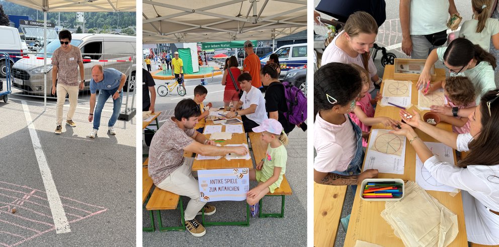 Der Innsbrucker Bürgermeister Johannes Anzengruber beim römischen „Deltaspiel“ (links), während Kinder das römische Rundmühlespiel („ludus molaris rotae“) bastelten und spielten (Mitte/rechts).