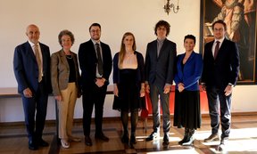 Vizerektor Gregor Weihs (Uni Innsbruck) und Stephan Agnolazza-Hoop (Ministerium für Äußeres, Bildung und Sport, Liechtenstein; beide rechts im Bild) gratulierten den Preisträger:innen. Im Bild mit den Laudator:innen v.l.: Ulla Ratheiser (Leiterin des Instituts für Anglistik), Preisträgerin Monika Kirner-Ludwig, Helmut Ritsch (Institut für Theoretische Physik), Preisträger Karol Piotr Gietka, Preisträgerin Stefanie Geisler, Petronel Tuluc (Institut für Pharmazie).