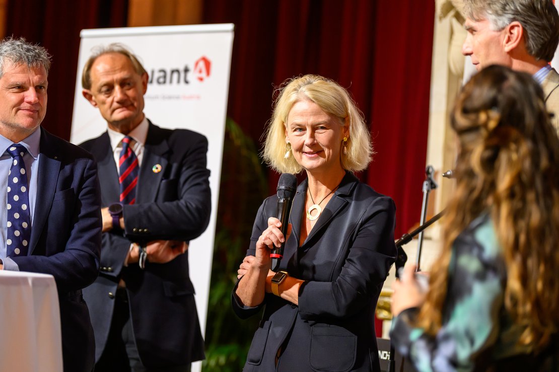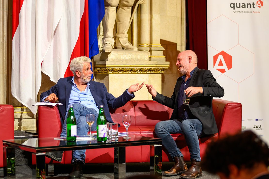 Nach Begrüßungsworten von Bundesministerin Eva-Maria Holzleitner sowie Wiens Kulturstadträtin Veronica Kaup-Hasler und einer Gesprächsrunde mit Vertreter:innen der quantA-Institutionen, brachten die Kabarettisten Stermann & Grissemann Quantenphysik auf originelle Weise auf die Bühne – sie interviewten Persönlichkeiten aus der Quantenforschung wie Francesca Ferlaino (Universität Innsbruck/IQOQI), Thomas Juffmann (Universität Wien) und Marcus Huber (TU Wien). Danach begeisterten junge Forscher:innen – darunter ein Team um Arfor Houwman aus Innsbruck – gemeinsam mit Bernhard Weingartner das Publikum mit einem „Quanten Science-Slam“. Durch das Bühnenprogramm führte Tanja Traxler (Der Standard) und Pianistin Juliane Sailer bot mit ihrer improvisierten Quantenmusik eine musikalische Umrahmung.