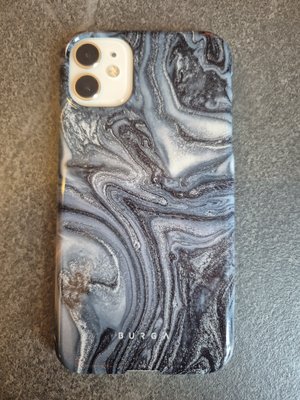 weißes iPhone mit Burga Hülle. Bilderkollage als Hintergrund. in der Damentoilette im EG gefunden