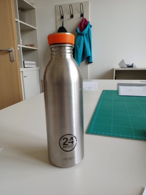 Thermosflasche/Trinkflasche, Grau, Orangener Rand am Deckel, Marke: 24 Bottles wurde am 13.11.2025 in der Bibliothek gefunden. Abzuholen während der Öffnungszeiten (Montag-Freitag 08:00-20:00 Uhr, Ausgenommen Feiertage) beim Infopoint der Fachibliothek für Altertumswissenschaften (2. Stock im Ágnes-Heller-Haus).
