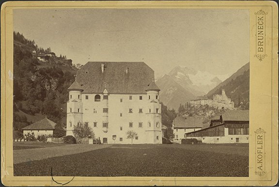 Sand in Taufers, links der Ansitz Neumelans (Wohnhaus und Praxis des Dr. Franz von Ottenthal), im Hintergrund Schloss Taufers (Fotografie, ca. 1940-50)