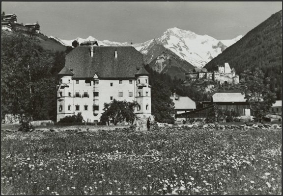Ansitz Neumelans, im Hintergrund Schloss Taufers (Fotografie, ca. 1960-70)