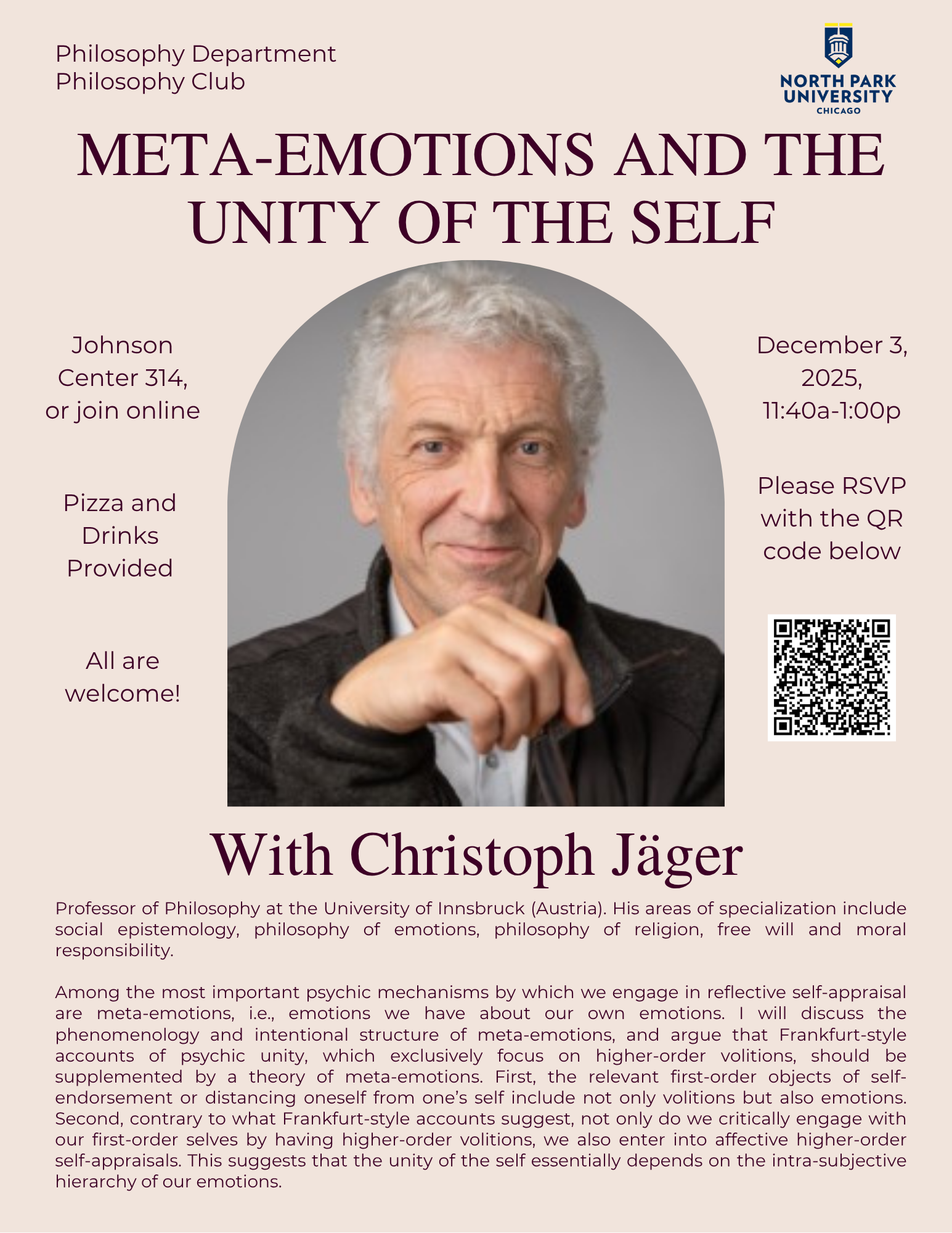 - Meta-Emotions and the Unity of the Self, Online-Vortrag, 3.12., North Park University & Philosophy Club, Chicago