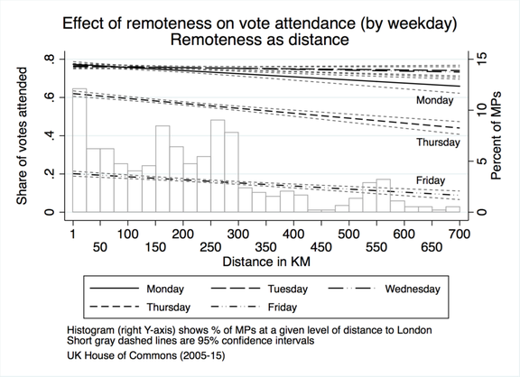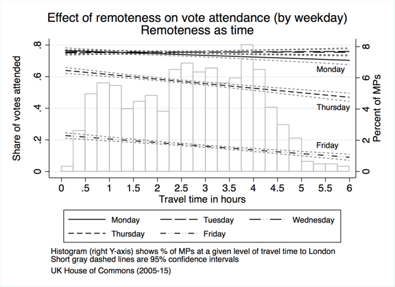The key findings in terms of attendance are shown in Figure 1: regardless of whether remoteness is measured as distance or as travel time, the farther away a constituency is from Westminster, the fewer votes are attended by its MP. The extent to which this is the case, however, depends on the day of the week a vote takes place. On Tuesdays and Wednesdays (the two overlapping top lines), attendance is highest, and independent of how remote a constituency is; the two lines are essentially flat. On Mondays, there is a small effect of remoteness on attendance, with MPs from more remote constituencies attending votes at a lower rate than those from constituencies nearer London. A much stronger effect was found for attendance on Thursdays and Fridays, where MPs whose constituencies are far from Westminster attended votes at much lower rates than their fellow legislators from more proximate constituencies.