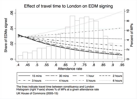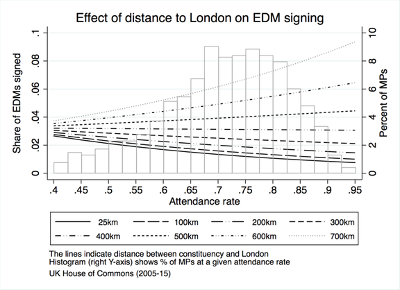 Thus, the MPs with the highest attendance rate, who have little to compensate for, differ in their behaviour depending on how remote their constituency is; the ones from more remote constituencies use EDMs in addition to attendance to signal to their voters that their interests are being represented at the centre, whereas MPs with similar attendance rates from more centrally located constituencies have no need to send such signals. Less active MPs behave much the same regardless of where their constituency is located.