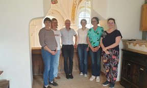 Als Auftakt der gemeinsamen Exkursion führte Dr. Peter Brandl die Teilnehmer:innen kundig durch die nahe gelegene Kirche St. Peter. Eine Fehlfunktion der Tür im Turm brachte das Erlebnis des gemeinsamen Eingesperrt-Seins mit sich und sorgte für ein zusätzliches Abenteuer-Element …