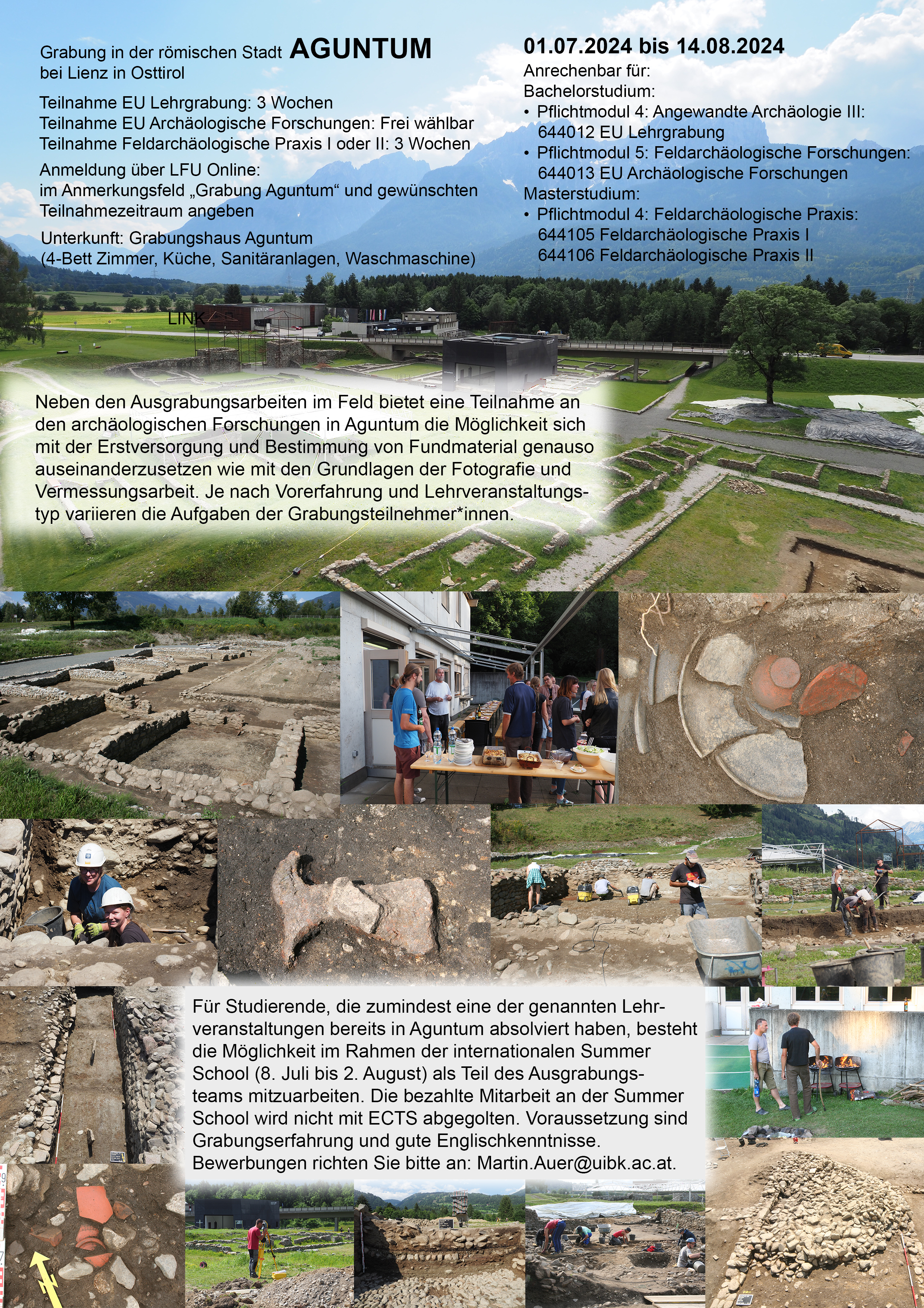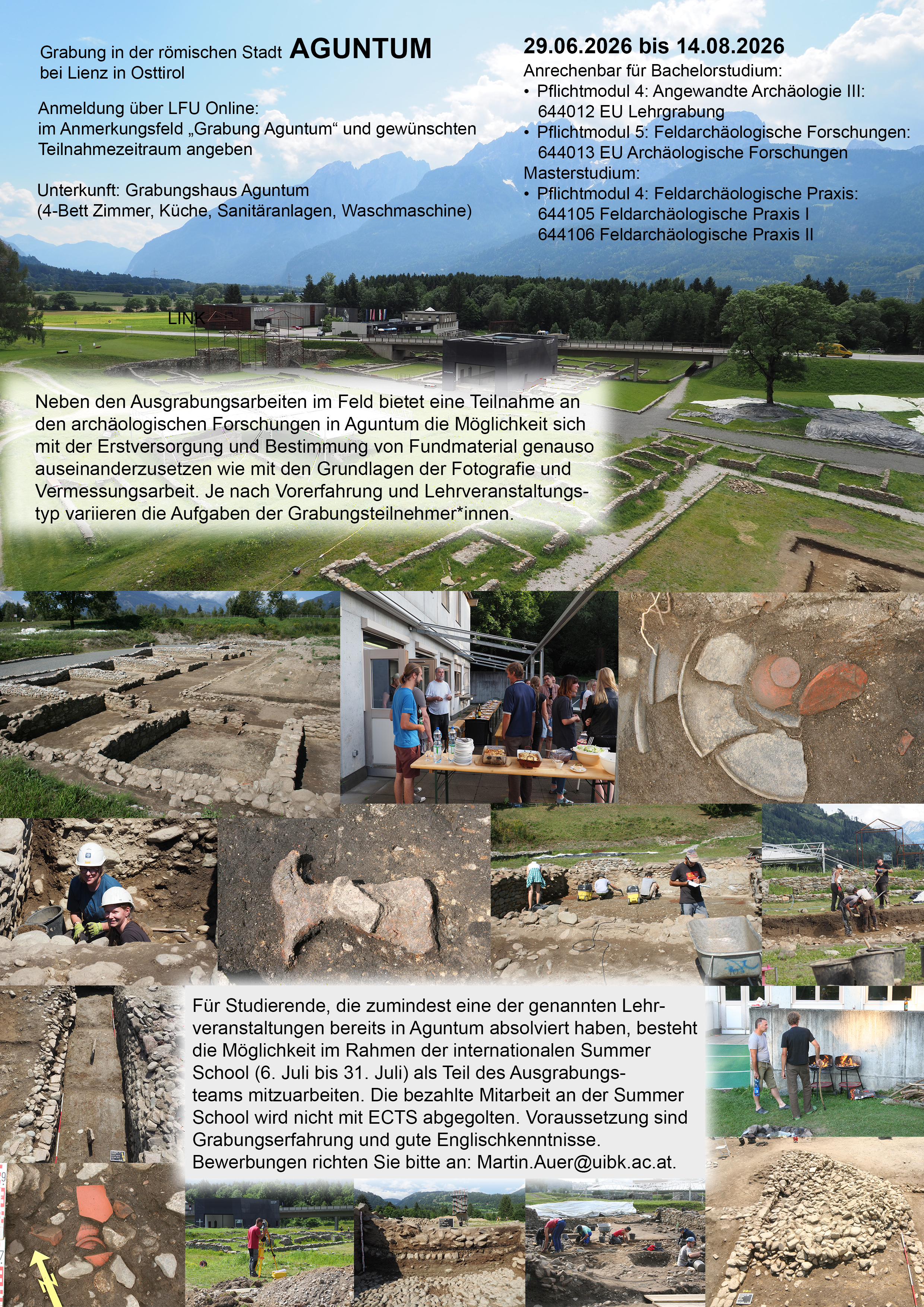 Abschlussarbeiten zum Municipium Claudium Aguntum umfassen sowohl die archäologische als auch die naturwissenschaftliche Anaylse der Befunde und Funde. Den Studierenden wird ein professionelles Umfeld mit Kooperationspartnern innerhalb und außerhalb es Instituts geboten, wobei die Betreuung der Abschlussarbeiten je nach thematischem Schwerpunkt individuell abgestimmt wird.