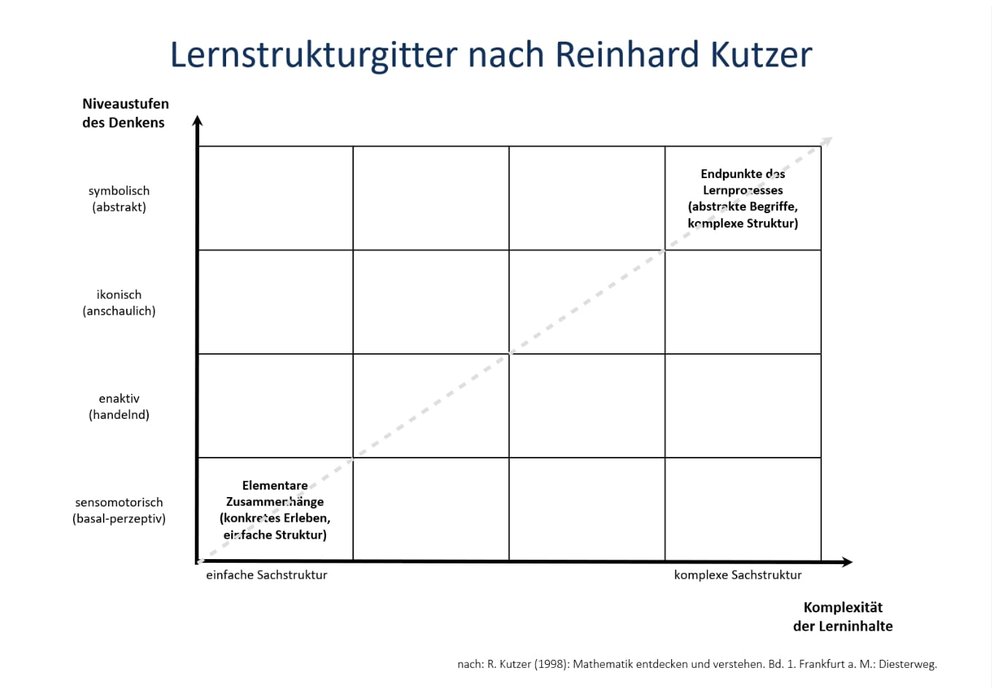 Das von Kutzer (1985) konzipierte Lernstrukturgitter wurde von Sasse und Schulzeck (2013) unter dem Arbeitstitel „Differenzierungsmatrix“ aufgegriffen und auf das Gemeinsame Lernen bezogen. Der Differenzierungsmatrix kommt dabei die Aufgabe zu, den Blick der Lehrenden auf die beiden Dimensionen kognitive Komplexität und thematische Komplexität zu lenken, um einen differenzierten Unterricht für eine heterogene Schüler:innenschaft zu planen und zu realisieren.