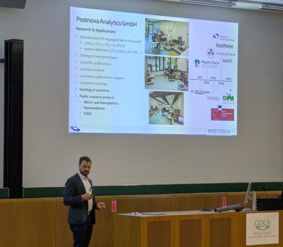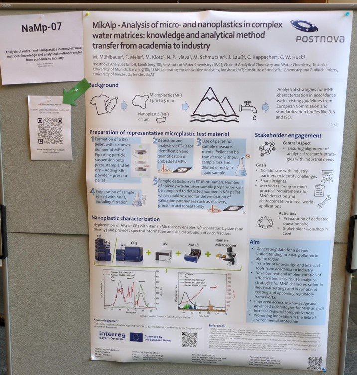 In May 2025, Postnova presented a poster at WASSER 2025, the annual meeting of the Water Chemistry Society. The contribution, titled “Characterization of Microplastics in Alpine Waters Using Field-Flow Fractionation and Detection,” showcased results from the MikAlp project.