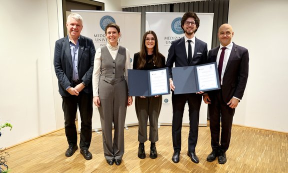 In einem Festakt an der Medizinischen Universität Innsbruck wurden Mitte Dezember Mittel aus der universitären Jubiläumstiftung an ein Kooperationsprojekt von Forschenden beider Innsbrucker Universitäten vergeben. Aaron Jaufenthaler und Marie-Christine Pali entwickeln eine alternative Methode zur Analyse von Bilddaten aggressiver Hirntumore.