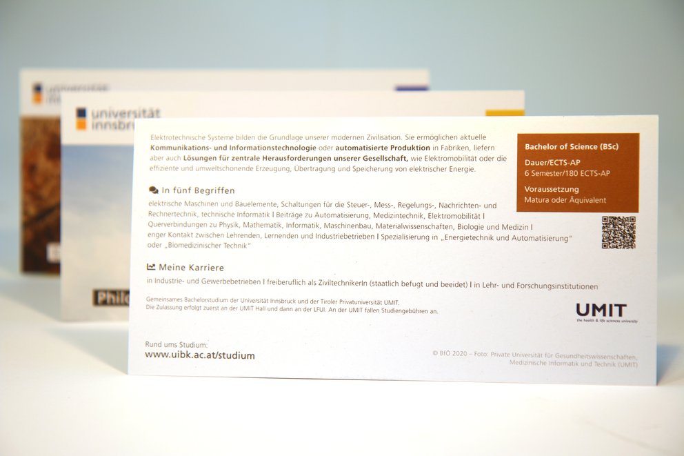 Es gibt für jedes Bachelor- und Masterstudium eine individuelle Sedcard; sie zeigt die wichtigsten Informationen für Studieninteressierte: