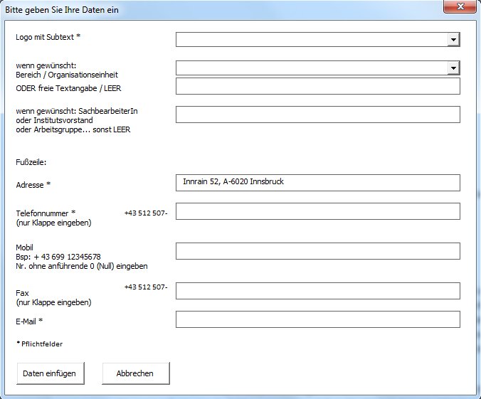 Hier können Sie nun Ihr gewünschtes Sublogo und sonstige Daten auswählen, welche dann in Ihr Word Dokument übernommen werden. Klicken Sie zum Abschluss auf Daten einfügen.