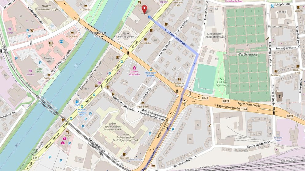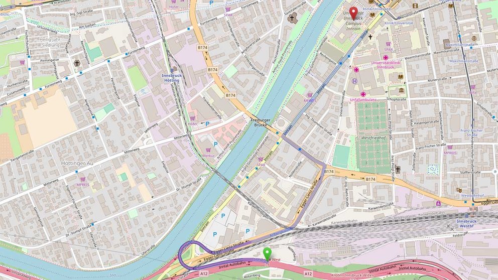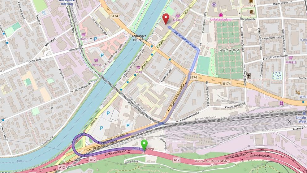 - Von A 12 bei Ausfahrt 79 – Innsbruck-West Richtung Innsbruck abfahren