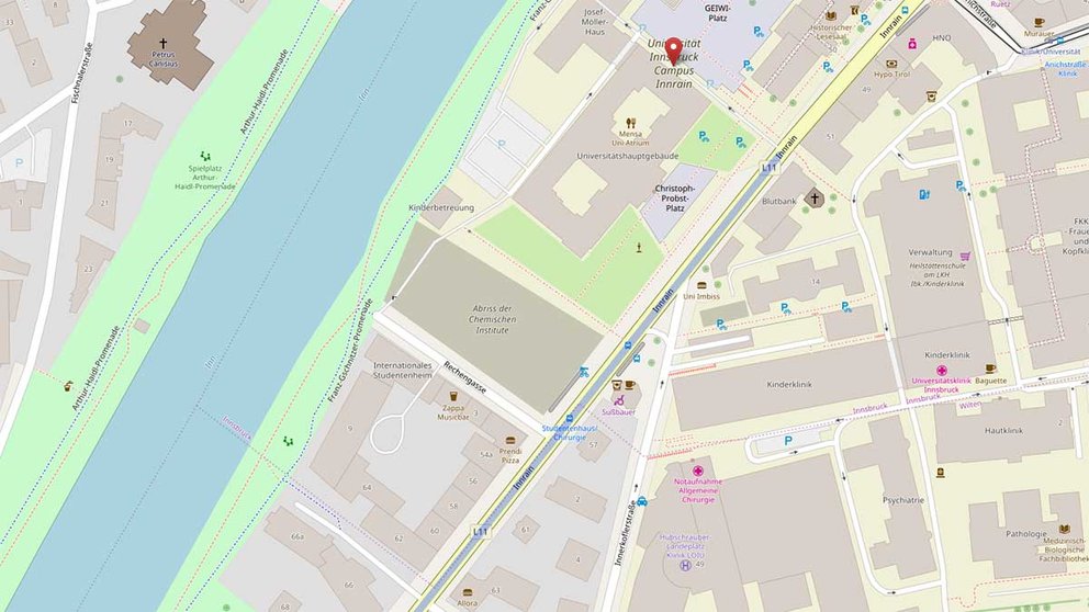 Der Campus Innrain ist ideal eingebettet in den Stadtkörper und liegt direkt an der Innpromenade, einem attraktiven Naherholungsgebiet Innsbrucks. Er ist Tirols größter Standort für Lehre und Forschung. Auch verkehrstechnisch liegt der Campus ideal: Zahlreiche Linien der Innsbrucker Verkehrsbetriebe führen zum Campus und die Altstadt Innsbrucks ist nur 15 Gehminuten entfernt.