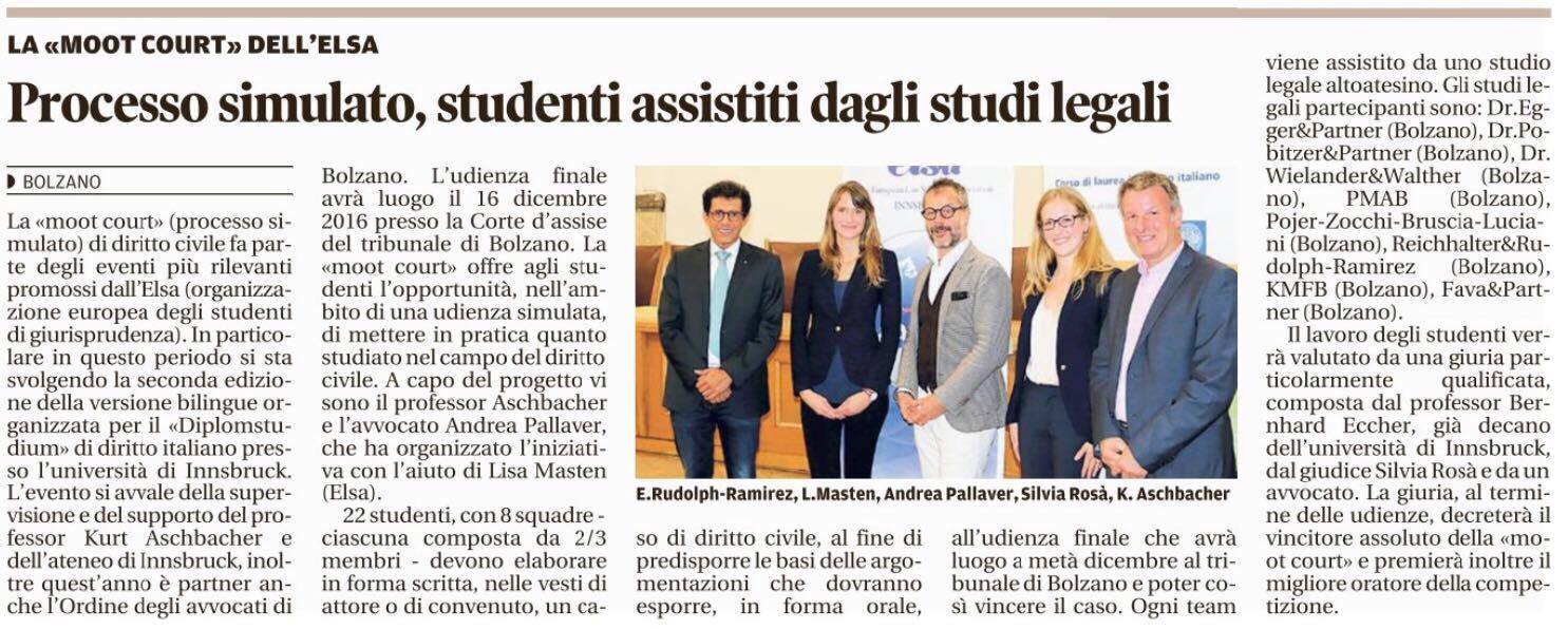 Im Laufe des Wintersemesters 2016 fand zum zweiten Mal der Moot Court aus italienischem Zivilrecht statt. Acht Teams beschäftigten sich mit vier spannenden Fällen aus unterschiedlichen Themenbereichen des italienischen Zivilrechts. Hierbei wurden sie von acht hochkarätigen südtiroler Rechtsanwaltskanzleien betreut.