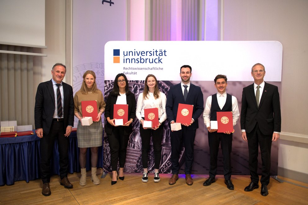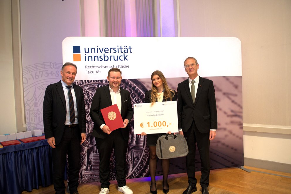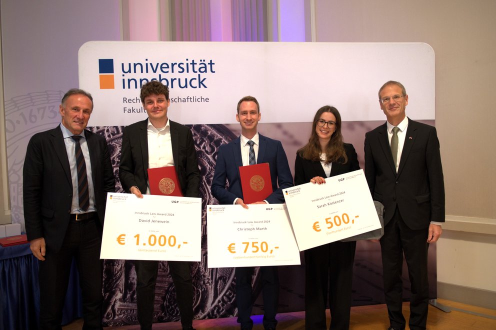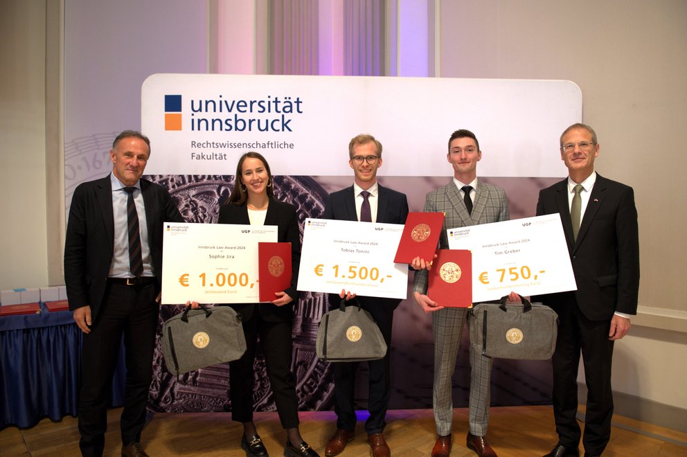 Im Rahmen des Fakultätstages am 29. November 2024 wurden Studierende und Absolvent:innen in sechs Förderunspreisen ausgezeichnet. Erstmals wurde heuer auch der Innsbruck Law Award an die besten Studierenden aus vier Studienrichtungen der Rechtswissenschaftlichen Fakultät verliehen: Diplomstudium Rechtswissenschaften, Bachelor- und Masterstudium Wirtschaftsrecht und Integriertes Diplomstudium Italienisches Recht.