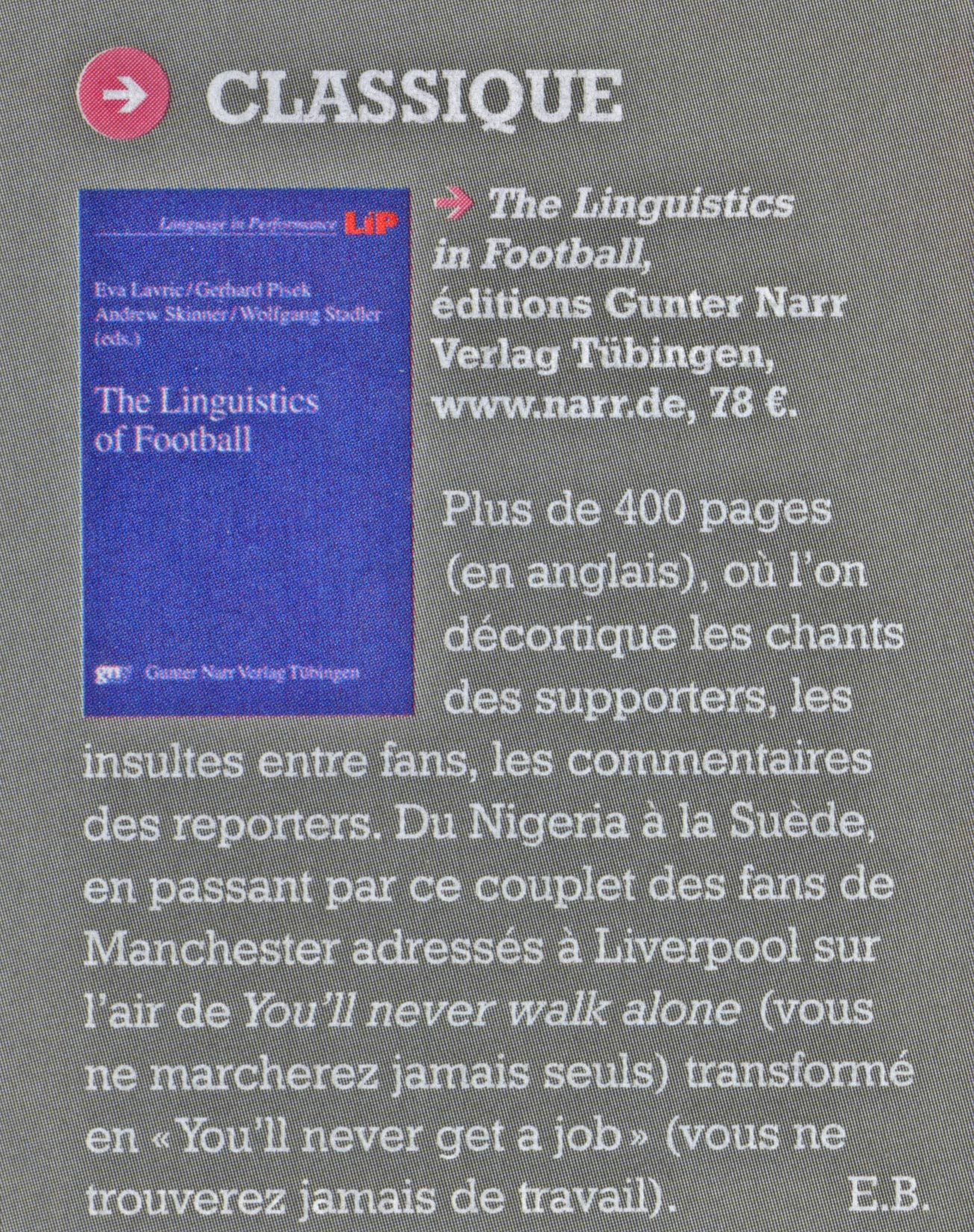 - E.B. (Erik Bielderman) "Classique. The Linguistics of Football. éditions Gunter Narr Verlag Tübingen" L’Equipe magazine 1371, 18.10.2008, p. 82 Download (JPG 646 KB)