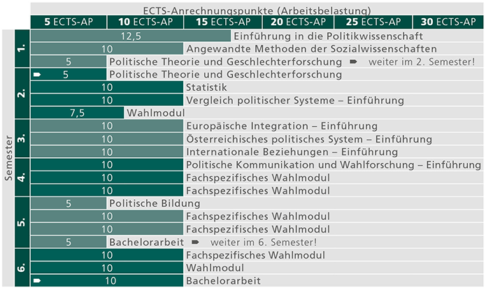 Mittels Curriculum können mehrere wichtige Fragen bereits vor Studienbeginn geklärt werden: welche Zulassungsvoraussetzungen gelten für das Bachelorstudium Politikwissenschaft , wie lange dauert das Studium, welche Module müssen absolviert werden etc.
