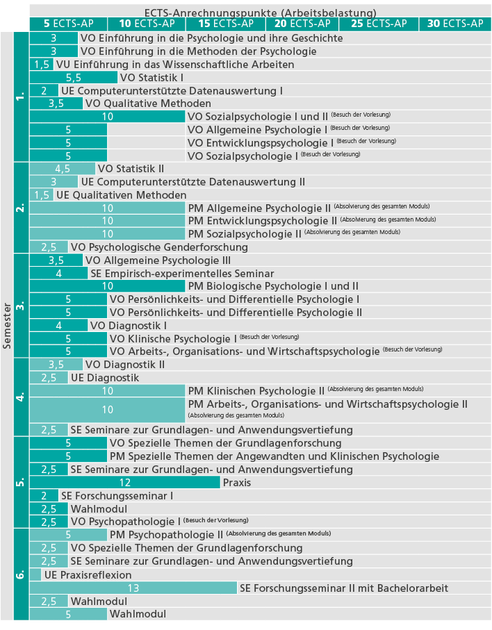 Die Regelstudienzeit beträgt 6 Semester bzw. 180 ECTS-AP, wobei gemäß Universitätsgesetz die Arbeitsbelastung eines Studienjahres 1.500 (Echt-)Stunden zu betragen hat und dieser Arbeitsbelastung 60 Anrechnungspunkte zugeteilt werden (ein ECTS-Anrechnungspunkt entspricht einer Arbeitsbelastung der Studierenden von 25 Stunden).