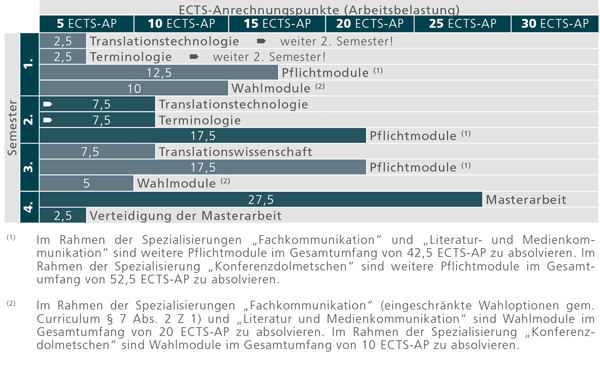 (1) Im Rahmen der Spezialisierungen „Fachkommunikation“ und „Literatur- und Medienkommunikation“ sind weitere Pflichtmodule im Gesamtumfang von 42,5 ECTS-AP zu absolvieren. Im Rahmen der Spezialisierung „Konferenzdolmetschen“ sind weitere Pflichtmodule im Gesamtumfang von 52,5 ECTS-AP zu absolvieren.