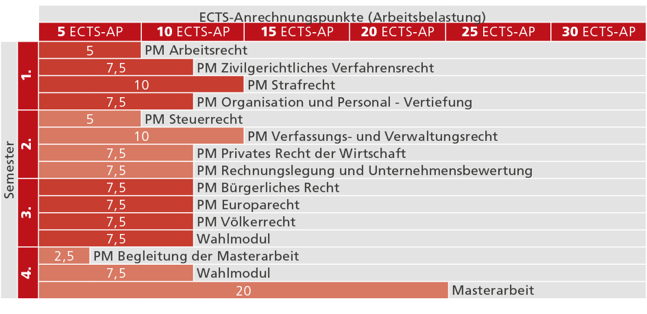 Durch das Curriculum können mehrere wichtige Fragen bereits vor Studienbeginn geklärt werden. Zum Beispiel welche Kriterien für die Anmeldung zum Master Wirtschaftsrecht erfüllt werden müssen, wie lange das Studium dauert, welche Module zu absolvieren sind und vieles mehr.